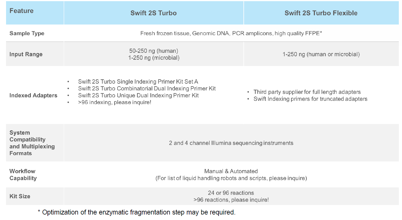 Swift 2S™ Turbo are a fast, efficient and cost-effective library prep solution. Leveraging a robust enzymatic fragmentation prep and flexible indexing, you can prepare high-quality whole genome and exome libraries using a broad range of input amounts and sample types.
